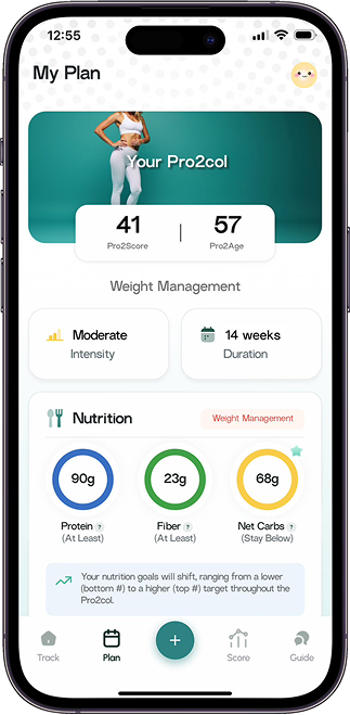 Pro2col uygulaması, gerçek zamanlı içgörüleri basit eylemlere dönüştürerek günlük yaşam tarzı rehberiniz haline gelir ve sizi doğru yolda tutarak en iyi halinizde hissetmenize yardımcı olur.